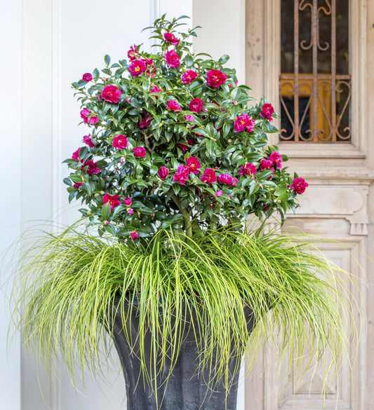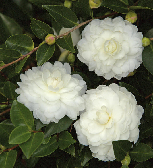 Consider a camellia for a patio tree, large specimen shrub, hedges, or foundation planting.